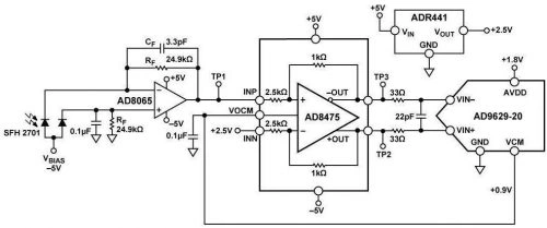 高速光电二极管信号调理电子线路图介绍本文聚焦于一款高速光电二极管信号调理电路,其具备暗电流补偿功能,旨在高效转换高速硅 PIN 光电