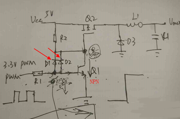 肖特基二极管的钳位下图为一个分立器件搭建的BUCK电路,但是不明白图中的两个肖特基二极管(D1 D2)的作用是什么8 3 2 肖特基箍位提高晶体